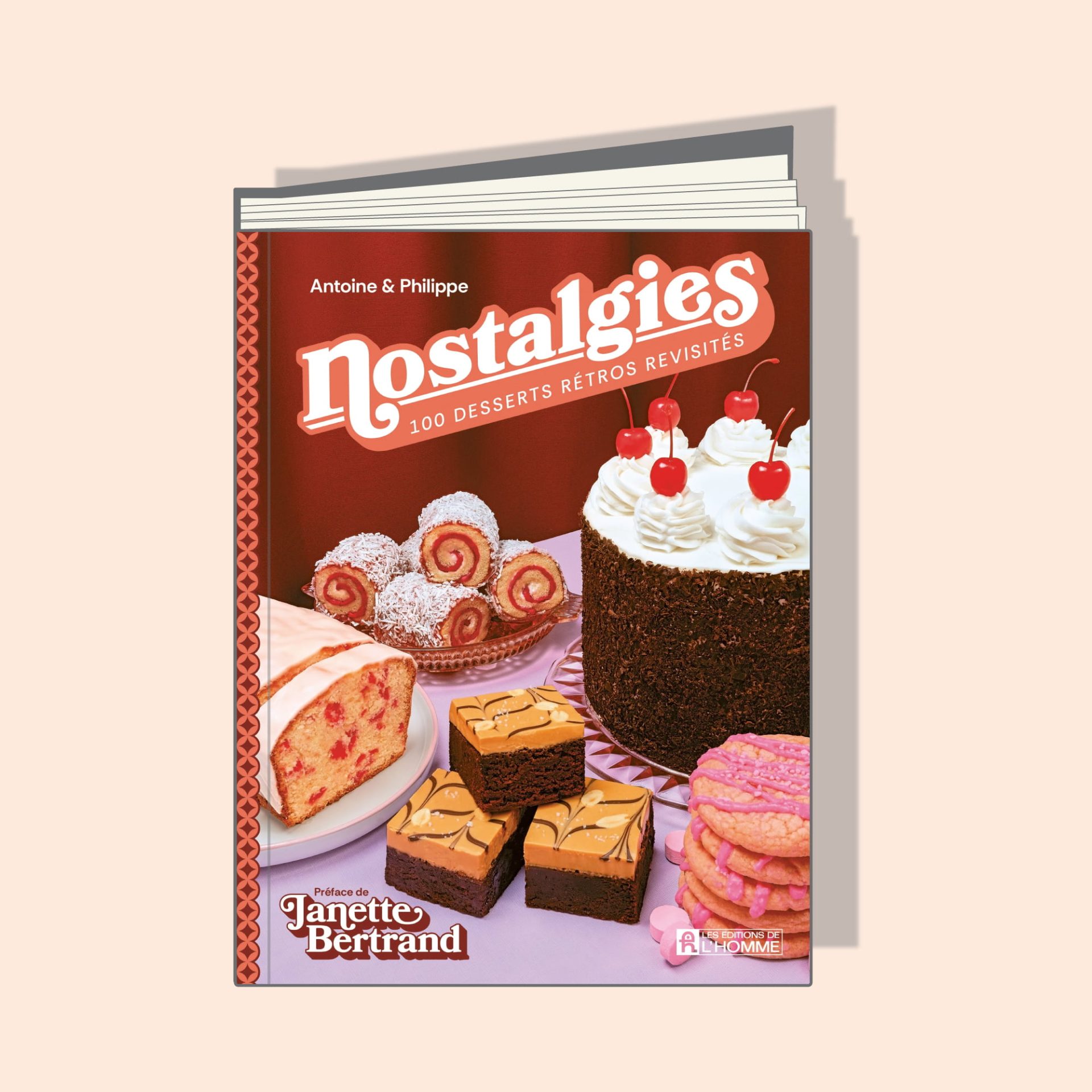 Dans Nostalgies, Antoine Goulet et Philippe Dickey nous ramènent droit au cœur de nos souvenirs d’enfance sous le thème de la pâtisserie. Le livre est un véritable hommage aux desserts (parfois un peu quétaines ou kitsch, mais ceux qu’on adore!) Chaque recette évoque une époque, une odeur familière ou un dessert qu’on croyait avoir oublié — mais qu’on retrouve ici, revisité avec tendresse et modernité. Même la grande dame, Janette Bertrand, y signe une préface empreinte de nostalgie!