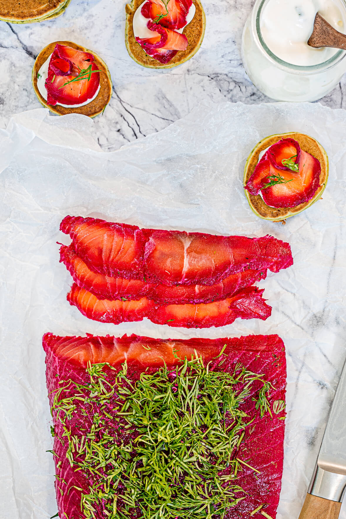 Accueil Recettes Fête des Mères Gravlax de saumon à la betterave Close Consulter mes favoris Close Avantages exclusifs Deviens membre BPT+ pour ajouter une recette en favori et profiter d'une foule d'autres avantages! Deviens membre BPT+ Gravlax de saumon à la betterave Table des matières Introduction Ingrédients Préparation FAQ Nutrition Commentaires Par : Hubert Cormier, Ph.D., docteur en nutrition Préparation 50 min Cuisson 30 min Réfrigération 24 h Congélation 0 min 20 portions Intermédiaire Table des matières Introduction Ingrédients Préparation FAQ Nutrition Commentaires Restrictions alimentaires Sans arachides Sans noix Catégories Entrées Hors-d'oeuvre Tu aimes? Tu partages! Gravlax de saumon à la betterave La meilleure recette de gravlax de saumon à la betterave à essayer! Le gravlax de saumon à la betterave est une entrée nordique chic et colorée qui marie à la perfection la fraîcheur du saumon cru mariné et la douceur terreuse des betteraves. Visuellement spectaculaire avec sa teinte rouge vibrante, cette recette est aussi simple qu’impressionnante à préparer à la maison. Le saumon est délicatement salé et sucré, parfumé à l’aneth et au citron, puis tranché finement pour fondre en bouche. Servi sur des blinis moelleux à l’avocat et accompagné d’une sauce crémeuse aux herbes, le résultat est à la fois raffiné et gourmand. Une recette idéale pour les brunchs festifs ou les entrées de repas spéciaux. Un plat nordique haut en couleur! Ce gravlax de saumon à la betterave est un vrai bijou visuel et gustatif. La betterave colore le saumon d’un rouge intense tout en lui apportant une note douce et terreuse. La vodka, facultative, intensifie la saveur et attendrit légèrement la chair du poisson. Les blinis à l’avocat ajoutent une touche moderne et moelleuse, tandis que la sauce crémeuse à base de yogourt et de fromage frais équilibre parfaitement l’ensemble. Servi froid, ce plat séduit par son élégance naturelle et sa fraîcheur. Tu aimes? Tu partages! BON DANS LA BOUCHE : Tu adores les recettes avec du saumon? Voici donc de nouvelles inspirations! Plats principaux Bouchées de saumon au air fryer Entrées Oeufs farcis au saumon fumé Entrées Mousse au saumon Plats principaux Le meilleur saumon teriyaki Entrées Blinis feta, betteraves et saumon fumé Bonà savoir Cuisiner l'avocat surgelé : Regarde bien le rayon des légumes congelés de ton supermarché! Tu y trouveras probablement des avocats congelés! Ils remplacent les avocats frais dans la plupart des recettes ou l’on doit le réduire en purée pour l’intégrer à d’autres ingrédients! Nos essentiels pour cette recette Fouet (10 pouces) Voir sur Amazon Poches à pâtisserie jetables Voir sur Amazon Cuillères et tasses à mesurer Voir sur Amazon Bols à mélanger en plastique Voir sur Amazon Pour d'autres équipements, petits électros ou ingrédients : DÉCOUVRE NOTRE BOUTIQUE AMAZON Ingrédients pour la recette de gravlax de saumon à la betterave Passer en mode cuisine Métrique Impérial Gravlax de saumon à la betterave Gros sel - ½ tasse 125 ml À découvrir! Sucre granulé - ¼ tasse 60 ml (50 g) À découvrir! Betteraves crues - 2 betteraves 2 betteraves pelées et râpées À découvrir! Vodka (facultatif) - 2 c. à soupe 30 ml (30 g) À découvrir! Aneth frais - ¼ tasse 60 ml haché À découvrir! Citron - 1 moyen 1 moyen zesté et pressé À découvrir! Saumon cru (sans la peau) - 1 lb (454 g) 1 lb (454 g) À découvrir! Blinis à l'avocat Farine tout usage - 1 tasse 250 ml (130 g) À découvrir! Farine de blé entier - ½ tasse 125 ml (65 g) À découvrir! Poudre à pâte - 1 c. à thé 5 ml (5 g) À découvrir! Sel de table - ½ c. à thé 2,5 ml À découvrir! Avocat - 1 avocat 1 avocat réduit en purée À découvrir! Oeufs - 2 gros 2 gros À découvrir! Lait - 2 tasses 500 ml (530 g) À découvrir! Aneth frais - 2 c. à thé 10 ml haché À découvrir! Sauce crémeuse Yogourt grec nature - 1 tasse 250 ml (250 g) À découvrir! Fromage à la crème léger - ½ tasse 125 ml (125 g) tempéré À découvrir! Ciboulette fraîche - 2 c. à soupe 30 ml hachée finement À découvrir! Avantages exclusifs Pour une expérience 100 % sans pub, abonne-toi à BPT+ Devenir membre BPT+ Avantages exclusifs Pour une expérience 100 % sans pub, abonne-toi à BPT+ Devenir membre BPT+ Préparation Passer en mode cuisine Gravlax de saumon à la betterave Étape 1 Préparer la marinade : Dans un bol, mélanger le sel, le sucre, les betteraves râpées, la vodka, l’aneth, le zeste et le jus de citron. Étape 2 Mariner le saumon : Dans un plat peu profond, étaler la moitié du mélange. Déposer le saumon sur le lit de marinade, puis recouvrir avec le reste du mélange. Frotter pour bien enrober le poisson. Couvrir de pellicule plastique et réfrigérer pendant 24 à 36 heures. Étape 3 Rincer et trancher : Retirer le saumon de la marinade et le rincer sous l’eau froide pour éliminer l’excédent de sel. Éponger délicatement à l’aide de papier absorbant, puis trancher finement. Blinis à l'avocat Étape 4 Préparer les blinis : Dans un bol, combiner les farines, la poudre à pâte et le sel. Dans un autre bol, fouetter l’avocat avec les oeufs, 1 tasse (250 ml) de lait et l’aneth. Incorporer les ingrédients secs en alternance avec le reste du lait jusqu’à l’obtention d’une pâte lisse et épaisse, semblable à une pâte à crêpes. Étape 5 Cuire les blinis : Chauffer une poêle antiadhésive à feu moyen et cuire environ 2 c. à thé (10 ml) de pâte par blini, jusqu’à ce qu’ils soient dorés des deux côtés. Réserver sur une assiette. Sauce crémeuse Étape 6 Préparer la sauce : Dans un bol, au batteur à main, fouetter le yogourt grec, le fromage à la crème et la ciboulette. Réfrigérer jusqu’au moment du service. Étape 7 Assembler : Garnir chaque blini d’une fine tranche de gravlax et d’une touche de sauce crémeus