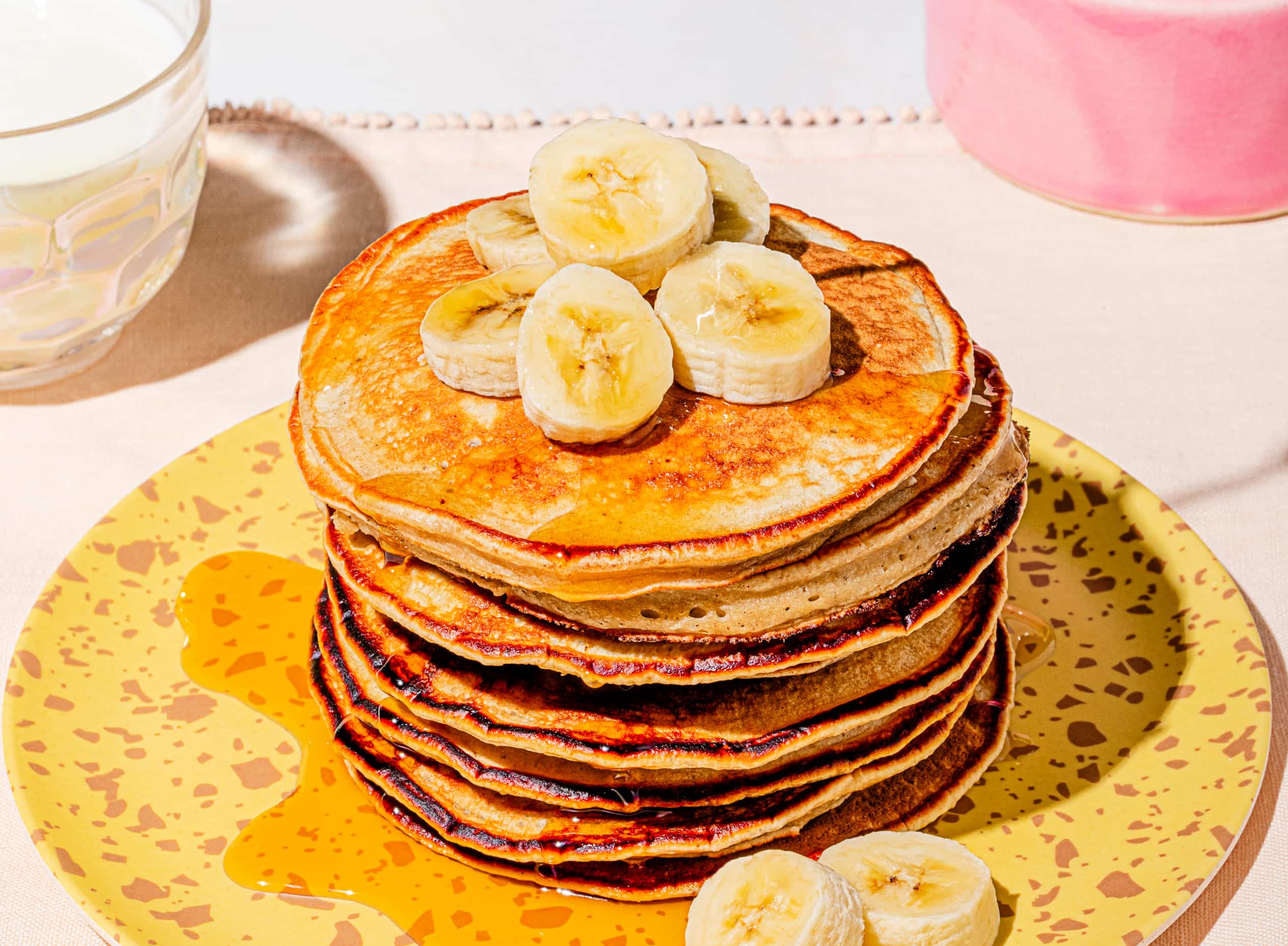 Découvre les meilleures recettes de pancakes pour transformer tes matins en vrai moment de bonheur! Les meilleures recettes de pancakes ont ce petit pouvoir magique : elles rendent l’heure du déjeuner plus douce, plus gourmande et franchement plus festive. Entre l’odeur de vanille qui flotte dans la cuisine, le sirop d’érable qui coule à la première bouchée et le plaisir de les garnir à l’infini, les pancakes sont la définition même du réconfort au déjeuner. Dans cet article, tu trouveras une sélection de recettes simples, savoureuses et ultra variées pour combler toutes les envies : pancakes aux bananes, dollar pancakes aux bleuets, pancake géant aux fruits, pancakes au kéfir, pancakes protéinés, sans oublier des versions plus originales comme les pancakes brouillés ou des recettes inspirées de desserts (style gâteau aux carottes ou pain d’épices). Que tu sois du genre brunch du dimanche, lunch sucré improvisé ou matin pressé, tu vas forcément trouver ta nouvelle recette coup de cœur. Pourquoi choisir de cuisiner des pancakes maison? Parce que c’est facile, rapide et toujours gagnant! En plus, les pancakes se personnalisent selon ce que tu as sous la main : fruits frais ou surgelés, yogourt, flocons d’avoine, kéfir, épices, noix… Tu peux les rendre plus nourrissants, plus protéinés ou simplement plus décadents, tout en gardant une base accessible. Prêt à faire le déjeuner? Sors ta poêle, prépare tes garnitures préférées et laisse-toi guider . Ces recettes de pancakes n’attendent que toi pour rendre tes matins (ou tes desserts!) encore meilleurs. [bon-a-savoir icon="https://bonpourtoi.ca/app/uploads/2024/09/Pancakes.svg"] POUR DES PANCAKES PROTÉINÉS Pour un apport protéiné plus élevé, découvre comment ajouter des protéines à tes pancakes! [/bon-a-savoir]
